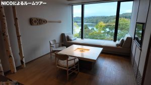 全客室が湖に面し、特に「露天風呂付き洋室」は、木のぬくもりと、アイヌ文化を踏まえたインテリアを備え、窓の外には湖と森の景色が広がります。