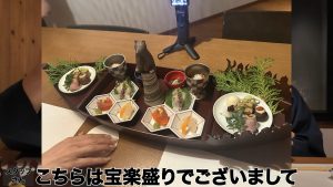 食事は、北海道の旬の海鮮を中心とした会席料理。毛ガニ、帆立、海老、鮭などを、アイヌの器や盛り付けを意識した演出で出してもらえるので、目にも贅沢!