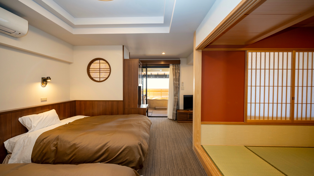 本館3階の露天風呂付和洋室。多目的トイレやバルコニーへのスロープ等、車いすでのご利用にも配慮した設計となっています。